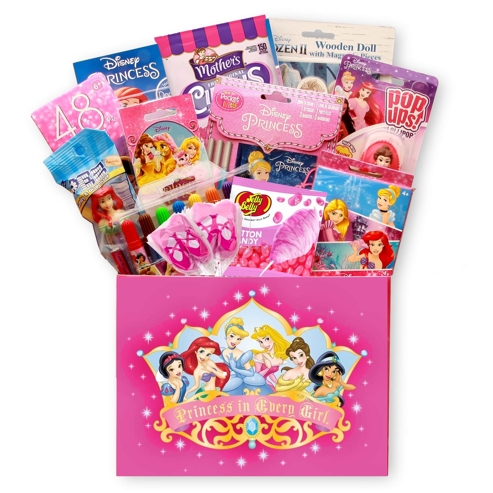 The Disney Princess Party Gift Box includes: Disney Princess 48 page coloring book, Frozen wooden dress up doll set, Disney princess sticker sheets, Disney frozen 48 pc puzzle, Disney Markers set, Disney marker case, Cotton Candy Flavored jelly beans, Mother's Frosted Circus cookies, Disney princess pez, Disney princess pop ups sucker with three re-fills, Disney poster set with markers. This gift measures 11" long by 8" wide and 15" tall and is wrapped in cellophane and topped with a handmade bow. Completed gift weighs 4 pounds. (Disney items come assorted between all the Disney's Princesses including Frozen, Mini Mouse , Little mermaid, and others)