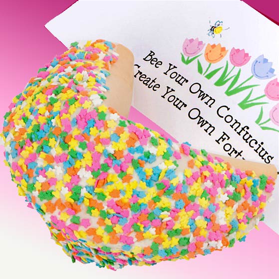 It's The Perfect Gift And Greeting All In One! This Giant Gourmet Fortune Cookie is a great way to help someone welcome in the spring season!!! Hand-dipped in the finest Belgian White Chocolates and decorated with delightfully tasty candy flower sprinkles! Your personalized message goes on the 1-ft-long Fortune inside making this a perfect way to send Good Fortune for any occasion! (250 character limit. Too many characters will result in an error on the fortune.) Each Giant Fortune cookie masterpiece is hand wrapped in a clear cello bag and tied with a lovely ribbon. We hand-pack each cookie in our 7" x 7" x 7" Glossy White Gift Boxes and top with matching Tissue Paper. (The card message you supply is what will appear on the fortune, 250 character limit)