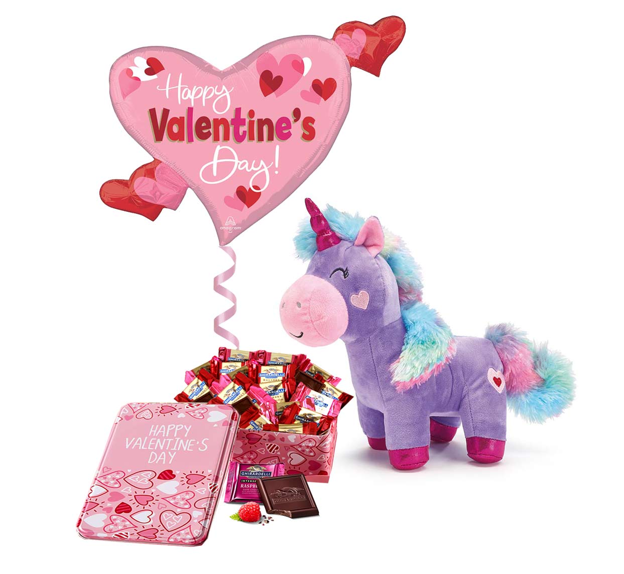 This Valentines day gift set includes: 12" plush Unicorn, Happy Valentines air filled 9" balloon, Happy Valentine's Day tin with Ghirardelli chocolates including, Raspberry filled dark chocolate, caramel filled milk chocolate, Dark chocolate squares, and Sea Salt Dark Chololate caramel filled. Tied with a hand made Valentine Bow.
