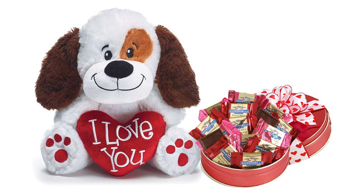 Valentines Day Gifts I Love You Plush Puppy with chocolates - perfect gift for college students, or valentine's gifts for kids. What a sweet way to send your love this Valentines day. This adorable plush puppy holds a sweet heart that says I love you and delivers a delicious assortment of Ghirardelli chocolates. This Valentines day gifts includes:12" Plush Love I Love puppy, Valentine tin with 14 assorted Ghirardelli chocolate squares including, caramel milk chocolate, Mint filled milk chocolate, Sea Salt milk Chocolate and Classic milk chocolate squares. Topped with a handmade Valentines day gift bow.
